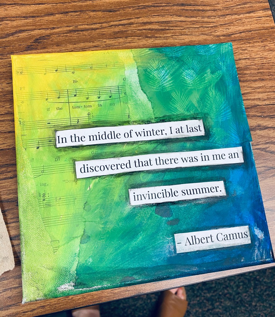 During our final meeting of the year, I got to incorporate something that I love to do, and I led our group through a mini mixed media art workshop. Each participant picked a quote that resonated with them, whether it was something they developed a deeper understanding of over the course of this past year, something they want to embody in the upcoming school year, or something that spoke to them in some other way, and we created visual representations of those inspiring words to display in our classrooms. I was so impressed and appreciative of every participant’s willingness to play along, despite many of them expressing feelings of uncertainty and nervousness at the idea of a creative and artistic experience. Everybody cheered each other on, asked others for ideas for inspiration, and allowed themselves time to play and create for themselves. Just for the sake of playing and creating. I didn’t ask for permission to post photos of the canvases that these incredible educators created for themselves, so I’ll only post a photo of mine below. I’m so excited to continue to deepen this practice next school year. I can’t wait to see what comes with next year’s group!